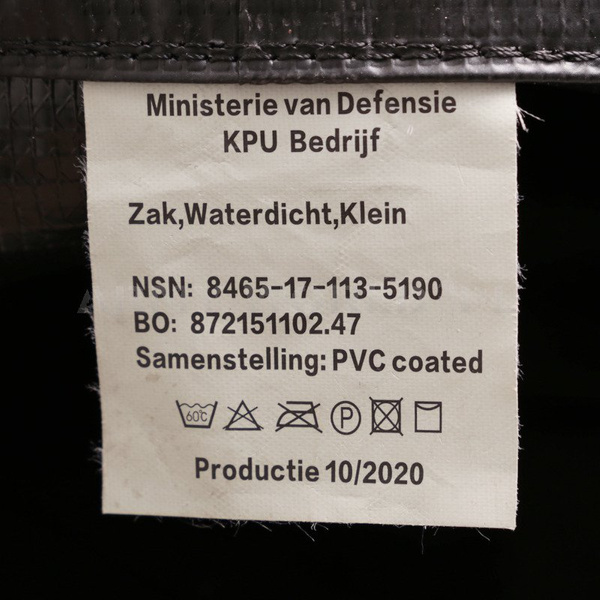 Worek przeprawowy pochodzący z zasobów wojsk holenderskich. Wykonany z gumowanego materiału o właściwościach wodoodpornych, z charakterystyczną kratką ripstop, która zapewnia większą odporność na uszkodzenia.