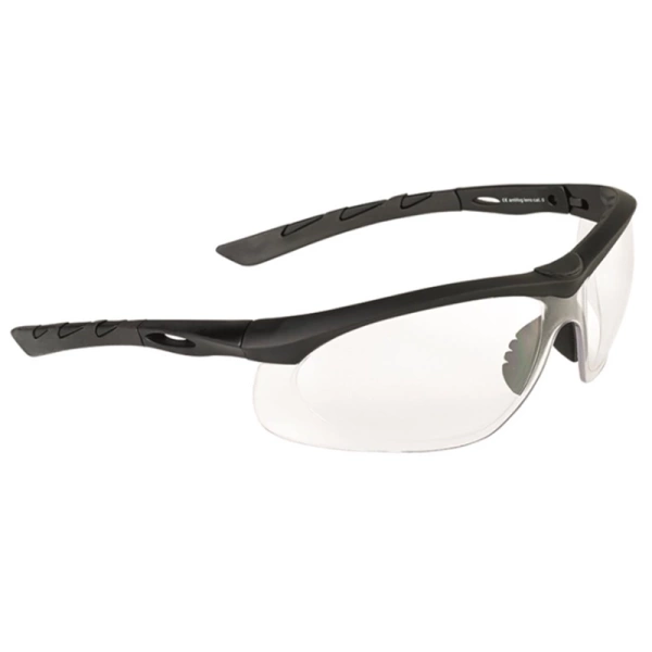 Lekkie okulary ochronne z gumowanymi, prążkowanymi zausznikami renomowanej marki SWISSEYE®. Idealne do noszenia z nausznikami ze względu na płaskie zauszniki.