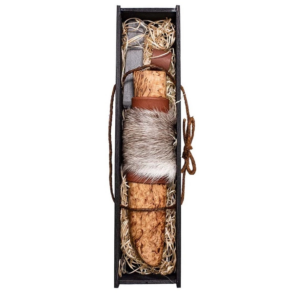 - Nóż w skórzanej pochewce z dodatkiem futra renifera w specjalnym pudełku prezentowym.