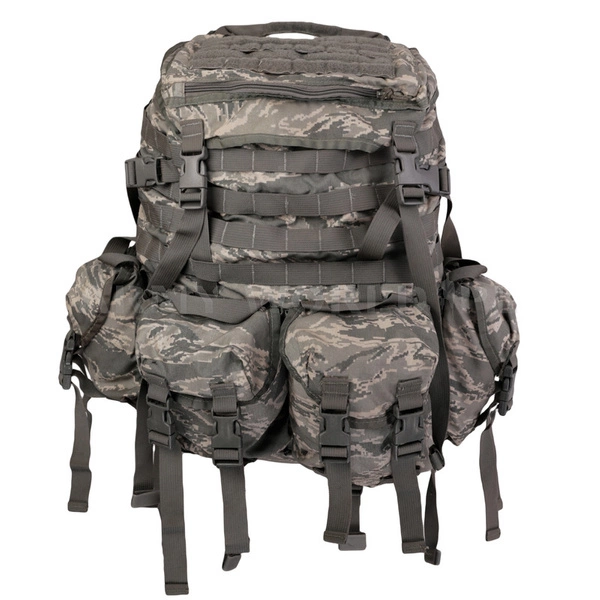 Duży plecak o pojemności około 65 litrów + cztery kieszenie na froncie zaprojektowany dla armii amerykańskiej.