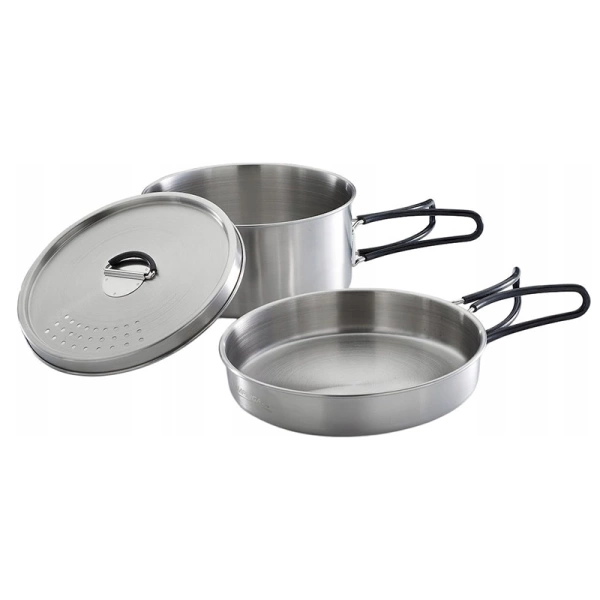 Zestaw lekkich naczyń wykonanych ze stali nierdzewnej. Zarówno garnek (1 l, 169 g, ⌀145 mm) jak i patelnia (0.5 l, 157 g, ⌀160 mm) posiadają rączki z silikonowym uchwytem. Dzięki perforowanej pokrywce (81 g, ⌀155 mm), bardzo łatwo odcedzić wodę.