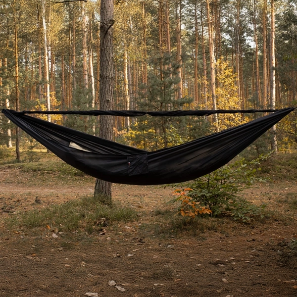 Hamak wykonano z lekkiej tkaniny ortalionowej w splocie Rip-Stop, która charakteryzuje się wyjątkową odpornością na uszkodzenia, wilgoć oraz jest bardzo lekka. Moskitiera posiada gęsty splot poniżej 1 mm, co skutecznie zapobiega przedostawaniu się insektów i zapewnia komfortowy odpoczynek. Model wyposażono w zamek błyskawiczny z obu stron, co ułatwia wejście do hamaka bez względu na preferencje użytkownika. Dodatkowo konstrukcja hamaka pozwala na umieszczenie karimaty wewnątrz, co podnosi komfort termiczny.