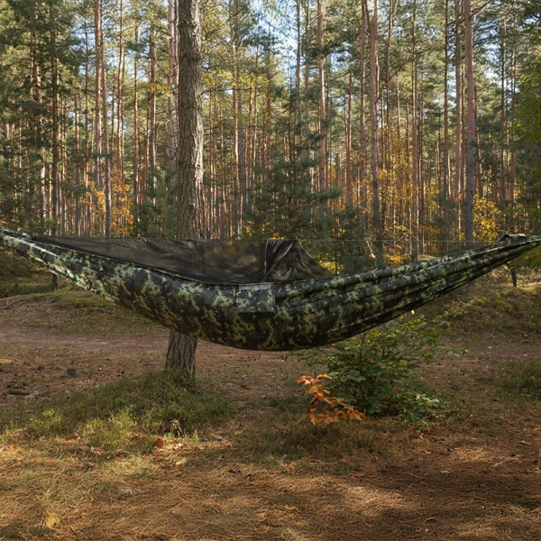 Hamak z moskitierą wykonany z lekkiej i wytrzymałej tkaniny poliestrowej, zapewniający wygodę i ochronę przed owadami. Dzięki zamkowi błyskawicznemu biegnącemu wokół całego obwodu, użytkownik ma łatwy dostęp do wnętrza hamaka, a moskitierę można otworzyć w dowolnym miejscu. Gęsty splot moskitiery (poniżej 1 mm) skutecznie chroni przed insektami, gwarantując komfortowy wypoczynek.