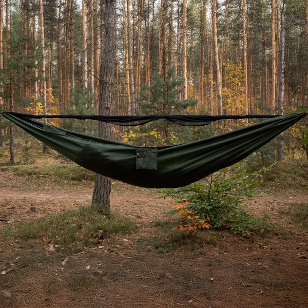 Hamak turystyczny o wymiarach 300 x 150 cm, wykonany z wytrzymałej, nieelastycznej tkaniny poliestrowej, charakteryzującej się lekkością, dużą odpornością na wilgoć oraz zwiększoną trwałością. Dzięki solidnej konstrukcji, hamak można zawiesić na odległość do 7 metrów między drzewami. Dodatkowo, konstrukcja pozwala na umieszczenie karimaty wewnątrz, co znacząco poprawia komfort użytkowania.