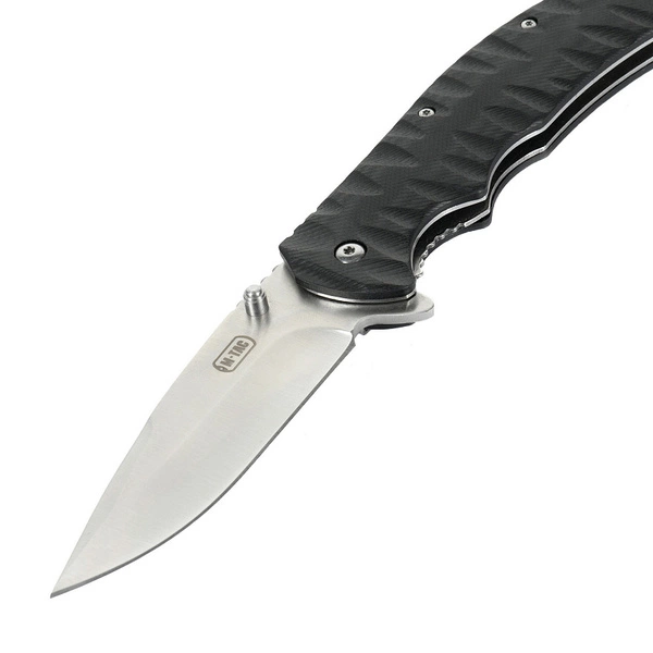Rękojeść wyposażona została w okładziny z trwałego, lekkiego i sztywnego materiału G10, o antypoślizgowej, ryflowanej powierzchni z profilowaniem pod palce. Taka konstrukcja gwarantuje nie tylko pewny chwyt, ale także wysoką odporność na wstrząsy i uszkodzenia mechaniczne. Ostrze można otworzyć na dwa sposoby – za pomocą flippera lub przy pomocy wycięcia na kciuk. Praktyczny klips umożliwia wygodne przypięcie noża do kieszeni i szybki dostęp w razie potrzeby. Dodatkowy otwór na smycz lub linkę zabezpieczającą zwiększa funkcjonalność noża.