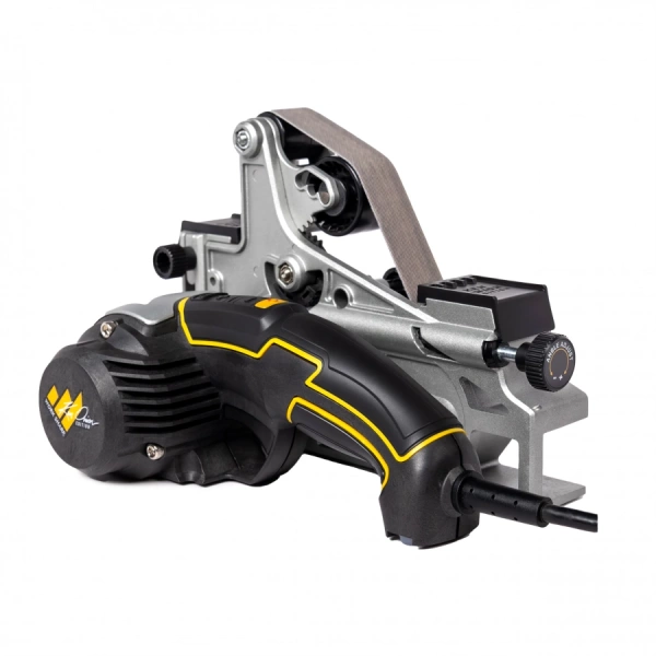 Przystawka szlifierska do Work Sharp Ken Onion Edition Mk.2 umożliwia regulację profilu szlifowania w 3 pozycjach bez użycia narzędzi, ustawienie kąta możliwe jest w trakcie pracy za pomocą ergonomicznego pokrętła. Płyta szlifierska i płyta dociskowa 90° umożliwiają szybkie ostrzenie grzbietów noży lub ponowne profilowanie ostrzy bez drgań. Przystawka cechuje się solidną polimerowo-metalową konstrukcją, odporną na przeciążenia powstające podczas szlifowania i modelowania ostrza. Przystawka łączy się z ostrzałką bez potrzeby stosowania narzędzi. Wymiana pasów ściernych to także prosta i szybka czynność, którą możemy wykonać samodzielnie. W przystawce można stosować różnej gradacji pasy ścierne o rozmiarze 25,4 x 457 mm. Napięcie pasa jest kontrolowane poprzez system 4 rolek, regulowanych w zakresie od 10° do 35° (z dokładnością do 1°). Prędkość pracy taśmy, w zależności od rodzaju wykonywanej czynności, możemy ustawić w zakresie 1200-2800 SFM (stopa kwadratowa na minutę). Położenie centralnej rolki transportowej można łatwo zmieniać bez użycia narzędzi, co umożliwia dostosowanie naprężenia (wysokości) pasa ściernego w zależności np. od rodzaju szlifu noża. Przystawka szlifująca Work Sharp pozwala na precyzyjne wykonanie czynności oburącz oraz z pełną widoczność procesu, co pozwala na szybkie i łatwe do osiągnięcia rezultaty.