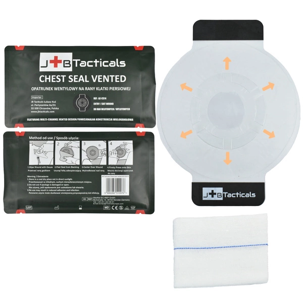 Produkt idealny do ratowania życia w przypadku ran postrzałowych. Dzięki innowacyjnej technologii jednokierunkowego zaworu wentylowego produkt umożliwia usuwanie powietrza zalegającego w klatce piersiowej, co zmniejsza ryzyko odmy prężnej oraz blokuje dostęp powietrza z zewnątrz.
