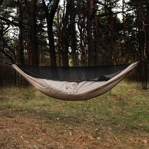 Hamak w wariancie z moskitierą Single Zip oznacza, że moskitiera jest zamocowana na jednym suwaku, co ułatwia dostęp do wnętrza hamaka.