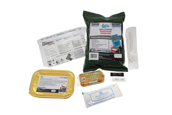 Posiłek na szybko nr 6 to wyjątkowo treściwa i aromatyczna propozycja dla osób poszukujących solidnego, rozgrzewającego dania, które można przygotować w każdych warunkach — podczas podróży, na biwaku, w pracy terenowej czy w sytuacjach awaryjnych. Bigos z kiełbasą o masie 300 g dostarcza intensywnego, tradycyjnego smaku oraz wysokiej wartości energetycznej wynoszącej 597 kcal, dzięki czemu świetnie sprawdza się jako szybki i sycący posiłek. W zestawie znajdują się także suchary specjalne SU-1 45 g, stanowiące praktyczny dodatek. Komplet został wyposażony w bezpłomieniowy podgrzewacz chemiczny oraz saszetkę z wodą, co pozwala na wygodne i bezpieczne podgrzanie posiłku bez użycia ognia. Wraz z posiłkiem użytkownik otrzymuje łyżkę, serwetkę oraz przyprawy (sól i pieprz), dzięki czemu danie jest gotowe do spożycia od razu po podgrzaniu.