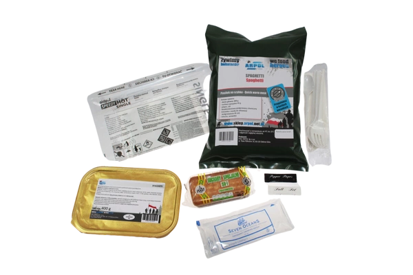Posiłek na szybko nr 7 to praktyczne i smaczne rozwiązanie dla osób potrzebujących szybkiego, pożywnego dania w każdych warunkach – podczas podróży, pracy w terenie, wyjazdów turystycznych czy biwakowania. Spaghetti o masie 300 g zapewnia sycący posiłek o wartości energetycznej 462 kcal, co czyni je idealnym źródłem energii w sytuacjach wymagających wygody i niezależności. W zestawie znajdują się również suchary specjalne SU-1 45 g, które świetnie uzupełniają smak potrawy. Zestaw wyposażono w bezpłomieniowy podgrzewacz chemiczny oraz saszetkę z wodą, dzięki czemu posiłek można podgrzać bez ognia – szybko, bezpiecznie i w każdych warunkach. Do kompletu dołączono także łyżkę, serwetkę oraz przyprawy (sól i pieprz), co pozwala spożyć posiłek natychmiast po podgrzaniu.