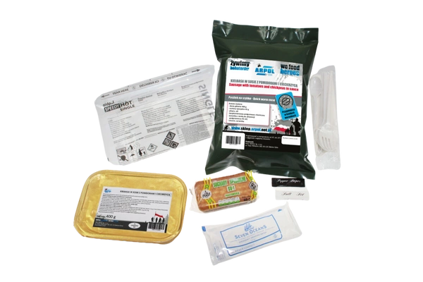 Posiłek na szybko nr 10 to wyjątkowo sycąca i energetyczna propozycja dla osób, które potrzebują solidnego dania w każdych warunkach — podczas podróży, wypraw outdoorowych, pracy w terenie czy sytuacji awaryjnych. Kiełbasa w sosie z pomidorami i ciecierzycą o masie 300 g oferuje intensywny, wyrazisty smak, a wartość energetyczna wynosząca aż 666 kcal zapewnia długotrwały zastrzyk energii. W zestawie znajdują się również suchary specjalne SU-1 45 g, stanowiące praktyczny i chrupiący dodatek do posiłku. Komplet wyposażono w bezpłomieniowy podgrzewacz chemiczny oraz saszetkę z wodą, co umożliwia szybkie i bezpieczne podgrzanie dania bez użycia ognia, w dowolnym miejscu i sytuacji. Dołączone akcesoria — łyżka, serwetka oraz przyprawy (sól i pieprz) — pozwalają na natychmiastowe spożycie posiłku po jego podgrzaniu.