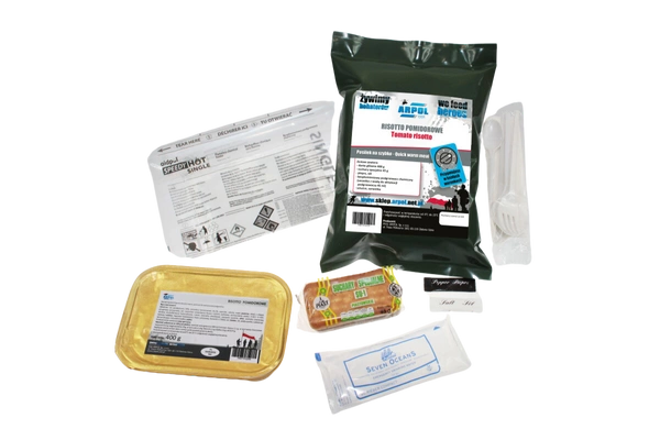 Posiłek na szybko nr 12 to smaczna i pożywna propozycja dla osób preferujących dania bezmięsne. Risotto pomidorowe o masie 300 g stanowi pełnowartościowy posiłek, który sprawdzi się w podróży, podczas pracy w terenie, na biwaku czy w sytuacjach awaryjnych. Wartość energetyczna wynosząca 516 kcal zapewnia odpowiednią ilość energii, a suchary specjalne SU-1 45 g stanowią praktyczny, chrupiący dodatek do dania. Zestaw wyposażono w bezpłomieniowy podgrzewacz chemiczny oraz saszetkę z wodą, dzięki czemu risotto można podgrzać szybko i bezpiecznie, niezależnie od warunków otoczenia. Dołączona łyżka, serwetka oraz przyprawy (sól i pieprz) pozwalają na natychmiastowe spożycie posiłku po podgrzaniu.
