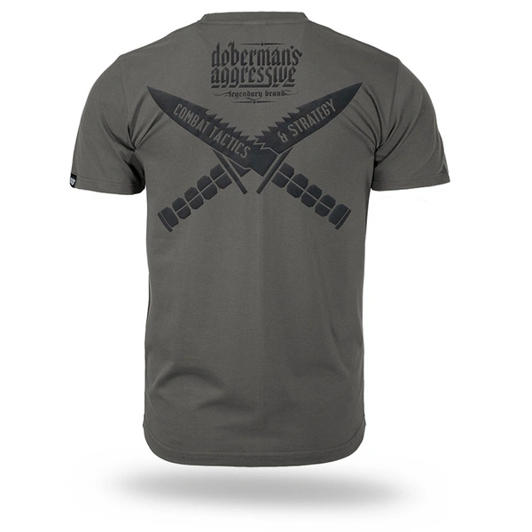 Koszulka uszyta z wysokogatunkowej bawełny, zapewniającej wygodę noszenia. Na plecach znajduje się duży nadruk wykonany techniką 3D z efektem puchnięcia, przedstawiający skrzyżowane taktyczne noże z ostrzami skierowanymi ku górze oraz napis "COMBAT TACTICS & STRATEGY". Powyżej grafiki znajduje się logo marki "DOBERMANS AGGRESSIVE". Przód koszulki jest gładki, bez nadruków.
