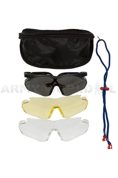- Glasses are equipped with transparent, yellow and tinted interchangeable panes. Frames have adjustable length and setting of shape of parts located behind ears. Glasses and accessories are placed in a cover that can be clipped to belt.