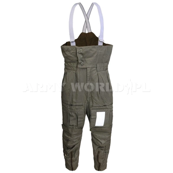 Oryginalne spodnie zimowe załóg lotniczych w kolorze olive z zasobów wojsk amerykańskich. Odzież wykonano z trudnopalnego materiału, odpornego na wysokie temperatury. Spodnie posiadają łącznie 14 kieszeni: dwie standardowe w miejscu bioder, sześć na wysokości ud, cztery przegrody na przybory do pisania oraz dwie na wysokości łydek zapinane na rzep. Spodnie zapinane za pomocą guzików i zamka błyskawicznego, posiadają dodatkowy pas z plastikową klamrą. Dodatkowo wyposażono je w regulowane szelki. U dołu nogawek wszyto sznurki umożliwiające regulację dopasowującą ubiór do sylwetki. Dodatkowo po bokach nogawek umieszczono suwaki umożliwiające szybkie zakładanie czy zdejmowanie spodni, bez konieczności zdejmowania obuwia.