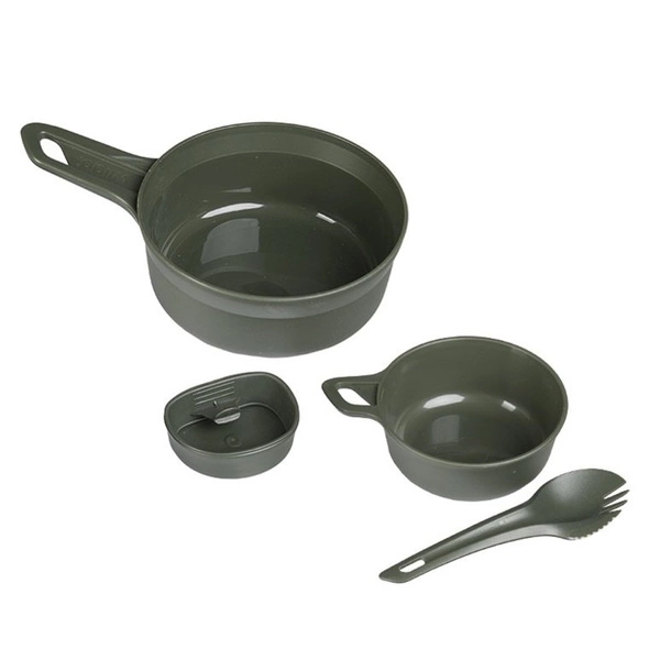 Model Adventurer składa się z głębokiego dużej miski 900 ml, małej miski 350 ml, kubka 250 ml oraz sporka. Zestaw idealny dla poszukiwacza przygód, przeznaczony jest dla jednej osoby. W zestawie praktyczna kieszeń z siatki ze stoperem i karabińczykiem.