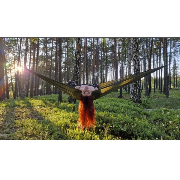 Wygodny i lekki hamak wyprodukowany przez firmę Bushmen. W komplecie posiada linki montażowe oraz siatkowa pojemna kieszeń, która jest także pokrowcem na hamak. Wykonany z nylonu spadochronowego, dzięki czemu nie chłonie wody oraz umożliwia swobodną cyrkulację powietrza. Jego wymiary pozwalają na wygodny wypoczynek bardzo wysokim osobom, usiąść lub po prostu się pobujać. Rozkładanie i składanie hamaka jest niezwykle łatwe. Potrójne szwy zapewniają wytrzymałość na obciążenia statyczne nawet do 200 kg. Jego wielkość po skanowaniu wynosi zaledwie 1 litr objętości.