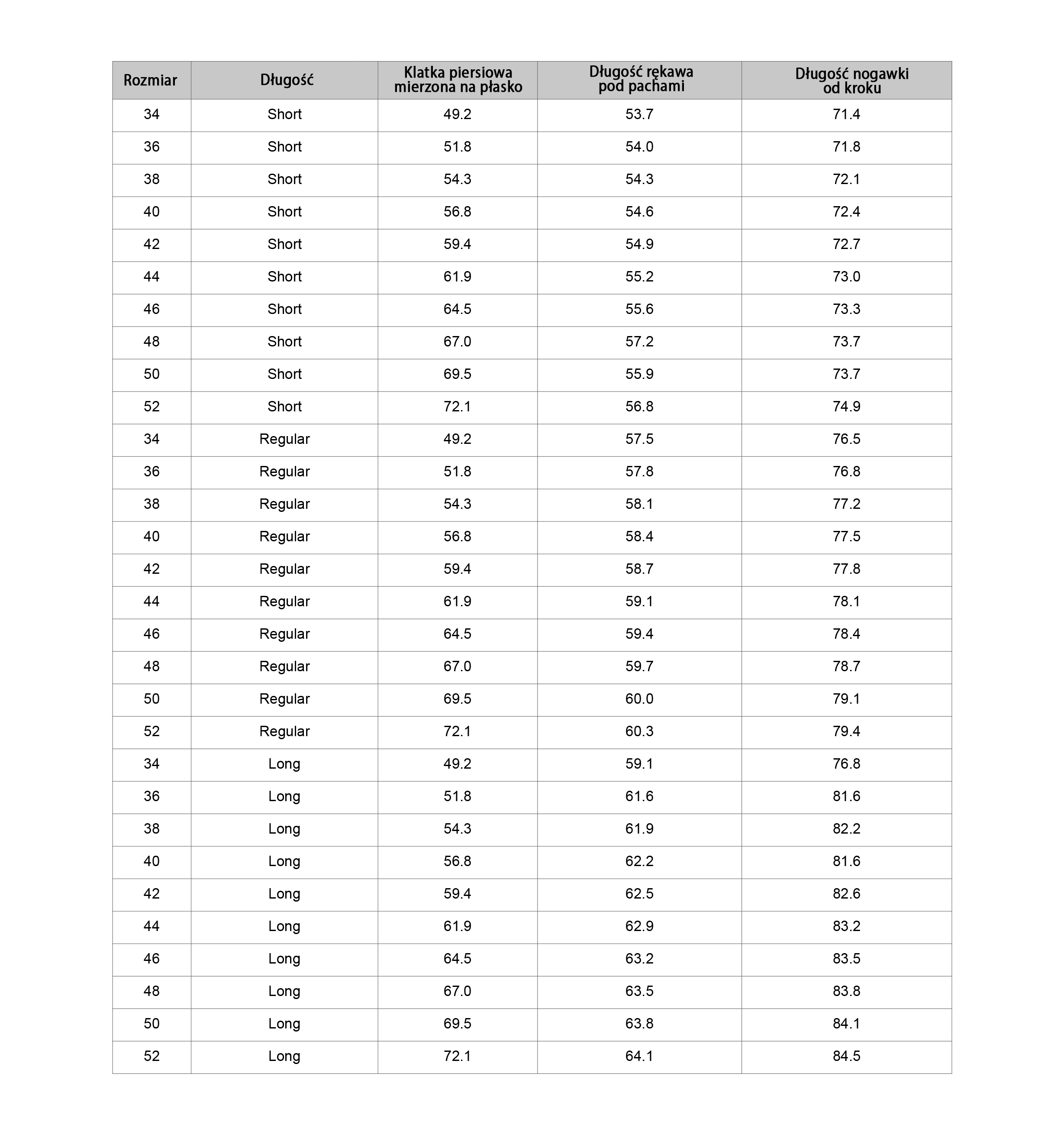Rozmiar: | Wersja: | Obwód w klatce: | Długość rękawa od pachy | Długość nogawki od kroku | Długość całkowita |