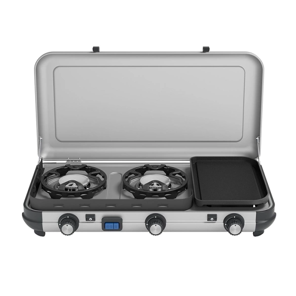 Kuchenka gazowa Stove 3 Burners INT marki Campingaz wyposażona jest w 2 niezależne palniki oraz ruszt, co zapewnia możliwość jednoczesnego przygotowywania różnorodnych potraw.