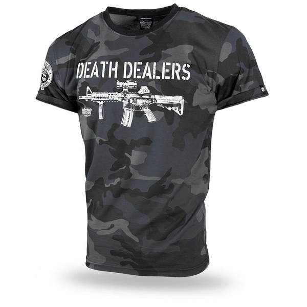 T-shirt wykonany z wysokogatunkowej bawełny. Z przodu koszulki duży nadruk karabinu oraz napis „Death Dealers”, zakończone małym logo marki Doberman’s. Na lewym rękawie wszyta została mała metka z logo marki. Na prawym rękawku kostucha z napisem „Death Dealers”.