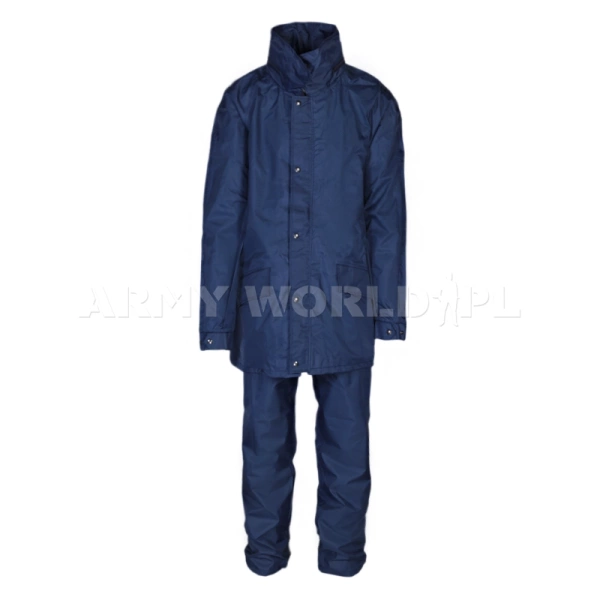 Komplet odzieży przeciwdeszczowej kurtka + spodnie, pochodzący z zasobów magazynów wojsk holenderskich. Zestaw wykonany jest z wysokiej jakości materiału z zastosowaniem membrany, która zapewnia ochronę przed deszczem i wiatrem z odprowadzeniem wilgoci na zewnątrz. Wszystkie szwy są dodatkowo podklejone co zapewnia 100% wodoodporność.