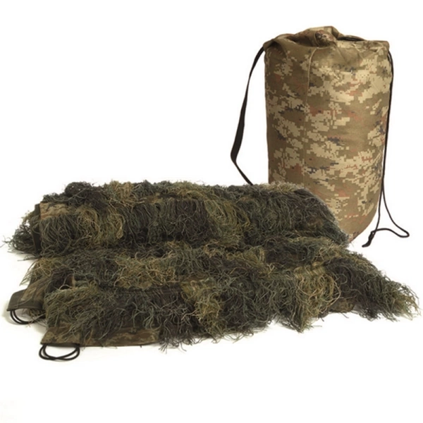 Siatka maskująca Ghillie Cover firmy Mil-Tec o wymiarach 140 x 100 cm bardzo dobrze maskuje w terenie, jest niezwykle praktyczna i uniwersalna, może posłużyć do maskowania karabinu, budowy schronienia lub ukrycia ekwipunku. Wysoka wytrzymałość tkaniny zapewnia trwałość.