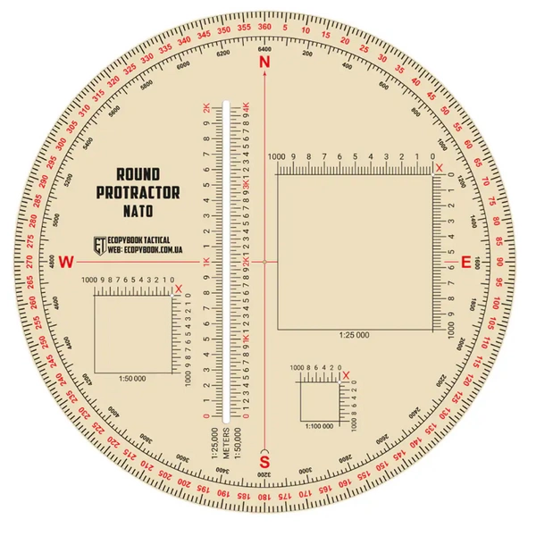 Na linijce umieszczono podziałki w różnych skalach, ułatwiające m.in. dokładne mierzenie odległości na mapach. Dodatkowo pełni ona funkcję szablonu do nanoszenia symboli zgodnych z oznaczeniami NATO. Kątomierz obejmuje zakres od 0 do 180 stopni, co pozwala na precyzyjne wyznaczanie kątów i kierunków, niezbędne w pracy z mapami i planowaniem działań terenowych.