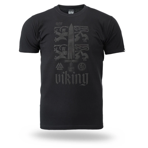 T-shirt uszyty z bawełny wysokiej jakości, gwarantującej wygodę podczas noszenia. Na przedzie widnieje efektowny nadruk z motywem skandynawskiego miecza, otoczonego heraldycznymi lwami, nordyckimi symbolami oraz stylizowanym napisem "Viking".