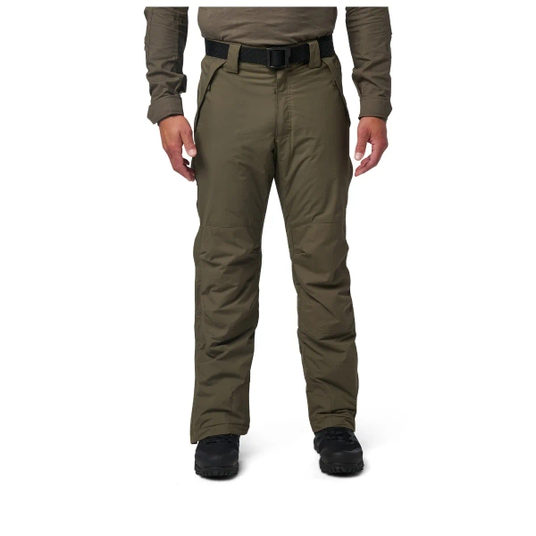 Wysoki tył pasa i szerokie szlufki zaprojektowane z myślą o pasach taktycznych zapewniają stabilność i wygodę w terenie. Spodnie wyposażone są w wodoodporne, dwukierunkowe zamki boczne z listwami przeciwwiatrowymi, zapinane kieszenie oraz wzmocnienia z tkaniny nylon oxford na kolanach i łydkach zwiększające trwałość w kluczowych miejscach. Regulowane nogawki z wewnętrznymi stuptutami, elastycznymi ściągaczami i haczykami na sznurówki skutecznie chronią przed śniegiem i wilgocią.