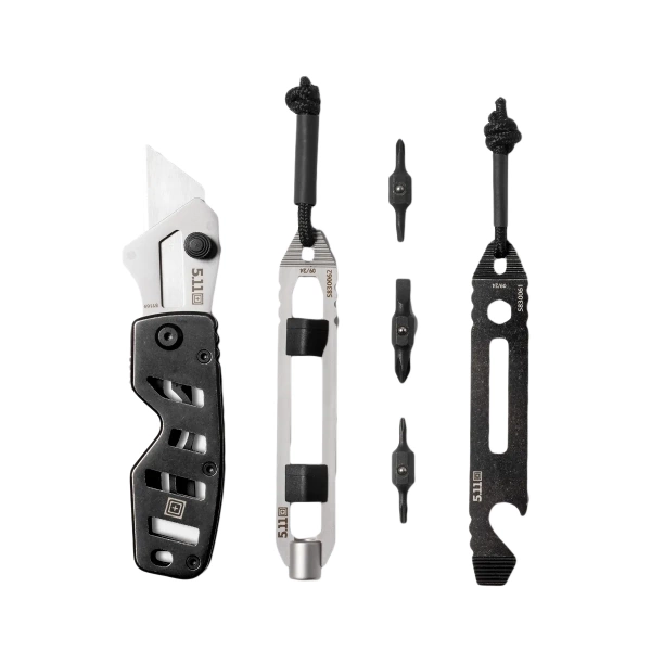 Zestaw zawiera składany nóż z wymiennym ostrzem, który zapewnia szybkie i precyzyjne cięcia w terenie, solidny wkrętak z sześcioma końcówkami oraz poręczne narzędzie do podważania z otwieraczem do butelek i gniazdem na bity.