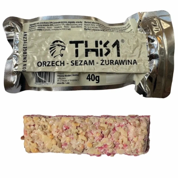 THIS-1 to wysokokaloryczny baton energetyczny, który łączy orzechy, sezam i żurawinę. Został zaprojektowany z myślą o trudnych warunkach i ekstremalnych sytuacjach. Optymalne połączenie cukrów i tłuszczów zapewnia szybki oraz długotrwały zastrzyk energii wtedy, gdy najbardziej tego potrzebujesz: w górach, na poligonie, pod namiotem czy w survivalowej sytuacji.