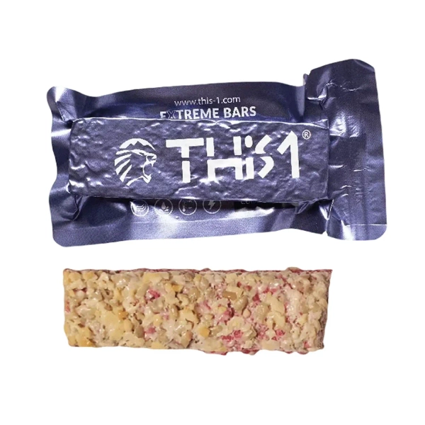THIS-1 to wysokokaloryczny baton energetyczny o smaku orzechowo-porzeczkowym. Został zaprojektowany z myślą o trudnych warunkach i ekstremalnych sytuacjach. Optymalne połączenie cukrów i tłuszczów zapewnia szybki oraz długotrwały zastrzyk energii wtedy, gdy najbardziej tego potrzebujesz: w górach, na poligonie, pod namiotem czy w survivalowej sytuacji.