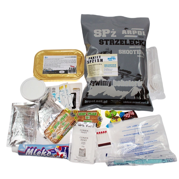 W zestawie znajduje się także opakowanie zapałek książeczkowych. Wśród dodatkowych akcesoriów znalazły się: owocowy napój herbaciany instant (15 g), napój izotoniczny (5 g), porcja kawy rozpuszczalnej, dwie porcje cukru, dwa cukierki z witaminą C, jeden cukierek kawowy, guma do żucia, sól i pieprz (po jednej sztuce), jednorazowa łyżka, tabletka do dezynfekcji 1 litra wody wraz z dedykowanym workiem, bezpłomieniowy podgrzewacz chemiczny z saszetką wody do jego uruchomienia, papier toaletowy, jednorazowa szczoteczka do zębów oraz trzy nawilżone serwetki.