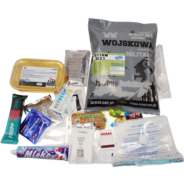 Racja żywnościowa zawiera danie główne w postaci lazania (300 g), specjalne suchary (45 g), czekoladę do picia (25 g), mleko zagęszczone w tubie (150 g) baton owocowo-zbożowy (35 g), suszone ziemniaki o smaku bekonu (20 g), napój izotoniczny (5 g), opakowanie zapałek książeczkowych.