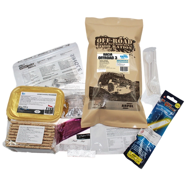 Zawartość racji żywnościowej obejmuje m.in. danie główne łazanki z kapustą i pieczarkami (300 g), chrupkie pieczywo żytnie (50 g), krakersy ryżowe (50 g), kisiel owocowy (30 g), napój herbaciany owocowy instant (15 g) oraz izotoniczny (5 g). W zestawie znajdują się również dwie gumy do żucia, jedno chemiczne światełko typu "lightstick", bezpłomieniowy podgrzewacz z dołączoną saszetką wody do jego aktywacji, przyprawy (sól i pieprz), jednorazowa łyżka oraz biodegradowalna słomka z filtrem umożliwiająca oczyszczenie do 1 litra płynów.