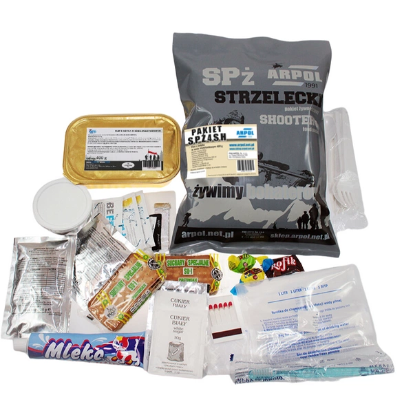W zestawie znajduje się także opakowanie zapałek książeczkowych. Zestaw uzupełniający zawiera owocowy napój herbaciany instant (15 g), izotoniczny napój w proszku (5 g), porcję kawy rozpuszczalnej, dwie saszetki cukru, dwa cukierki z witaminą C, cukierek kawowy, gumę do żucia, przyprawy (sól i pieprz po jednej sztuce) oraz jednorazową łyżkę. Do oczyszczania wody dołączono tabletkę do dezynfekcji 1 litra wraz ze specjalnym workiem.