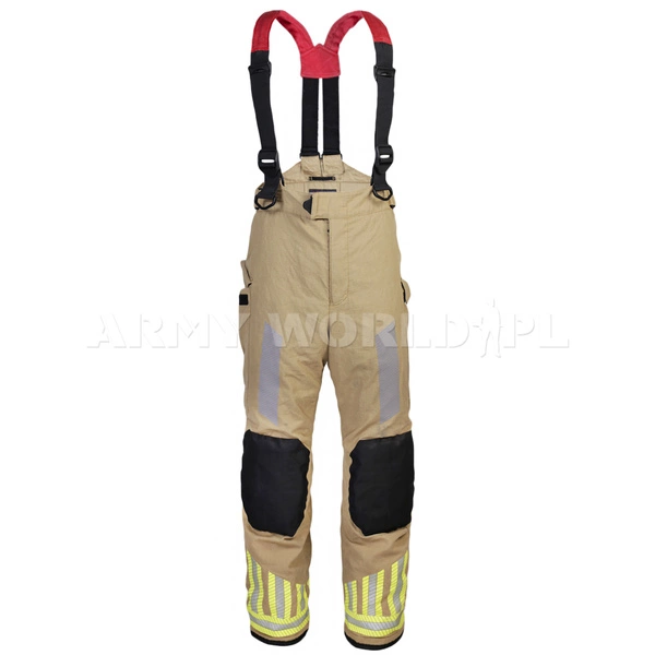 Spodnie strażackie w wersji na szelkach pochodzące z zasobów magazynowych.