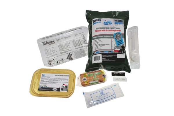 Posiłek na szybko nr 2 to praktyczna, energetyczna i wygodna propozycja dla osób, które potrzebują pełnowartościowego dania w dowolnych warunkach – podczas pracy w terenie, podróży, trekkingu czy biwaku. Aromatyczny kurczak z ryżem i warzywami o masie 300 g zapewnia sycący, zbilansowany posiłek, a jego wartość energetyczna wynosząca 483 kcal gwarantuje solidny zastrzyk energii. W zestawie znajdują się także suchary specjalne SU-1 45 g, stanowiące chrupiące uzupełnienie dania. Zestaw jest wyposażony w bezpłomieniowy podgrzewacz chemiczny oraz saszetkę z wodą, dzięki czemu można podgrzać posiłek bez użycia ognia – szybko, wygodnie i bezpiecznie nawet w trudnych warunkach. Do kompletu dołączono również łyżkę, serwetkę oraz przyprawy (sól i pieprz), co pozwala na natychmiastowe spożycie posiłku.