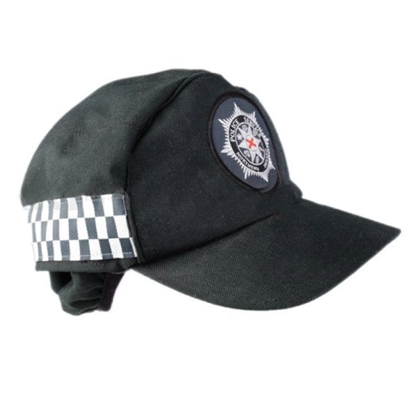 Czapka zimowa z daszkiem pochodząca z wojskowych zasobów magazynowych, wyposażona w naszywkę policyjną.